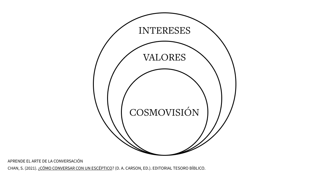 Un amigo mío que estaba entrenando como capellán de un hospital me dijo que una persona en realidad dejará caer pistas de que está lista para pasar la conversación al siguiente nivel. Nuestro trabajo es escuchar atentamente, captar las pistas y simplemente animarlo a continuar diciendo cosas como “cuéntame eso” o “¿cómo te hizo sentir eso?”. Eso les dará la confianza de llevarnos al siguiente nivel. En tercer lugar, funciona a la inversa, nosotros mismos podemos tomar la iniciativa para llevar la conversación al siguiente nivel. Lo hacemos simplemente haciendo preguntas. Por ejemplo: si les preguntamos qué han hecho el fin de semana, y nos dicen que han jugado al baloncesto, estamos en la capa de intereses de la conversación. Pero si luego preguntamos: ¿por qué juegas al baloncesto los fines de semana? Para responder a esta pregunta, tendrán que pasar al nivel de los valores. Podrían decir: me mantiene sano. Y luego, si preguntamos: ¿por qué valoras tanto la salud? Para responder, tendrán que pasar a la capa de visión del mundo. Y, podrían decir: solo se vive una vez, así que quiero vivir el mayor tiempo posible. O, en cuarto lugar, podemos pasar directamente a la visión del mundo. De la misma manera que preguntas como “¿qué hiciste el fin de semana?”, inmediatamente conducir la conversación de la capa de intereses, a preguntas sobre la visión del mundo. Por ejemplo: prueba con estas preguntas: “¿tienes una fe?, ¿cuál es la religión con la que te criaron tus padres? ¿oran?”.