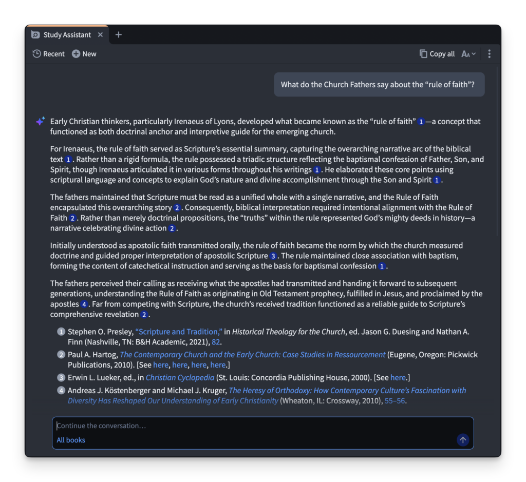 Por ejemplo, si preguntas: “¿Qué dijeron los padres de la Iglesia sobre [el tema que estés estudiando]?”, el Asistente de Estudio buscará en toda tu biblioteca para ofrecerte respuestas extraídas directamente de tus propios recursos de Logos. Las citas no solo son precisas, sino que también permiten hacer clic en ellas para ir directo a la fuente original, leer el contexto y comprobarlo por ti mismo.